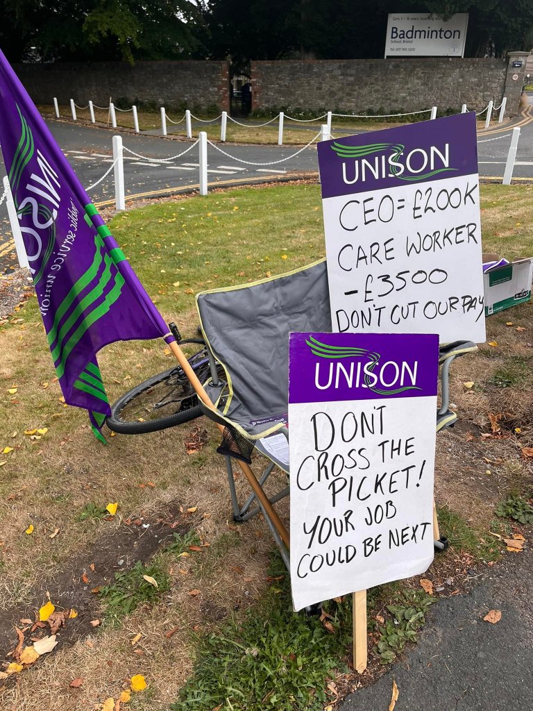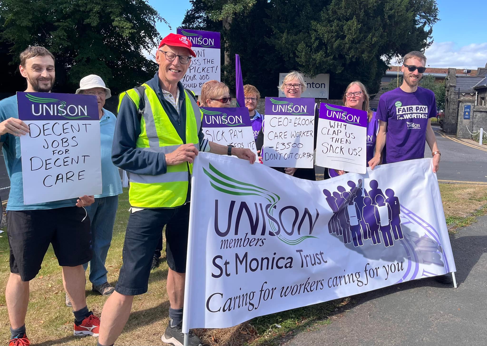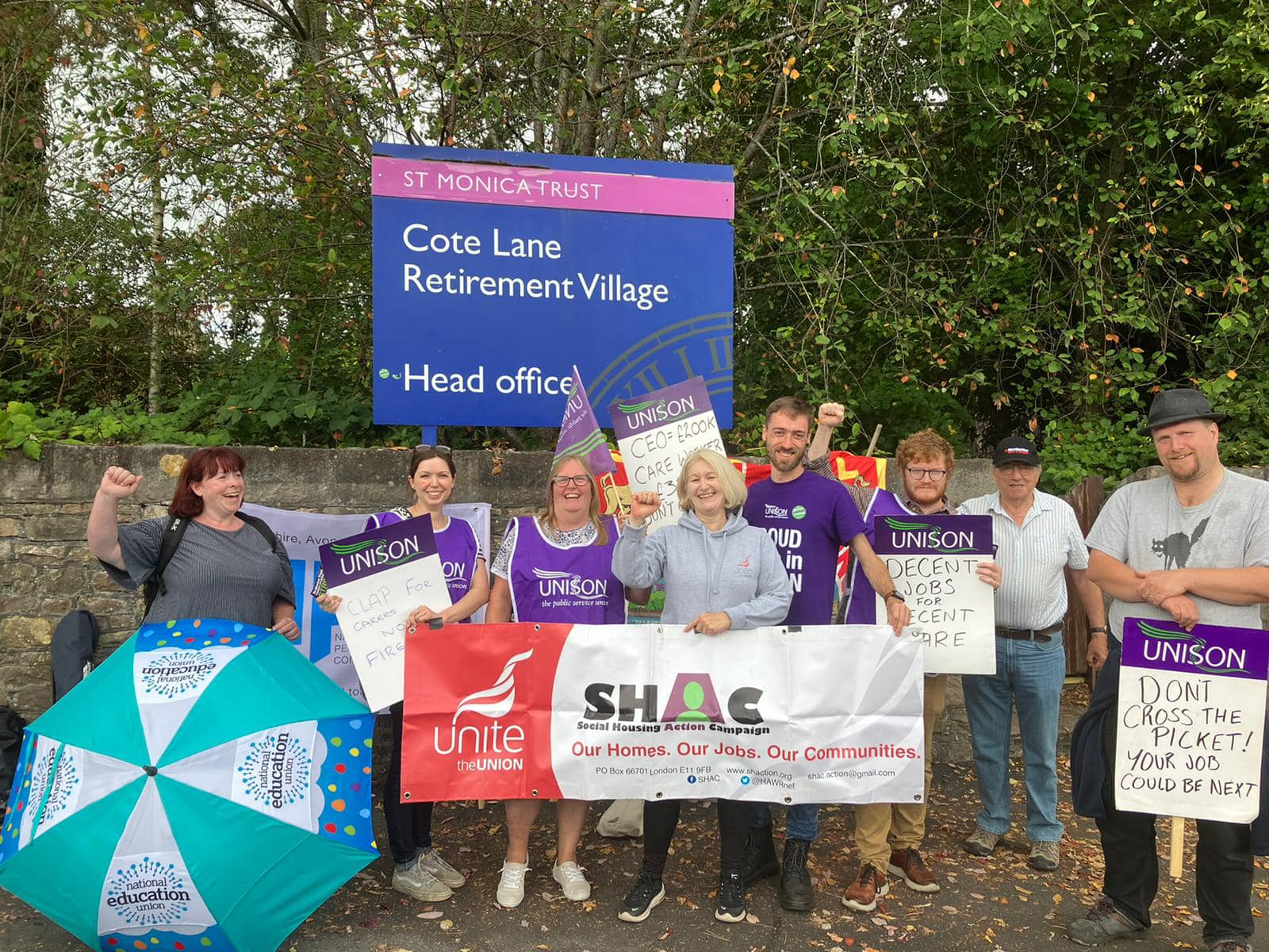 St Monica’s care workers are striking against cuts to pay totalling up to £3,500 a year, cuts to sick pay and working hours, workers being bullied into accepting changes.