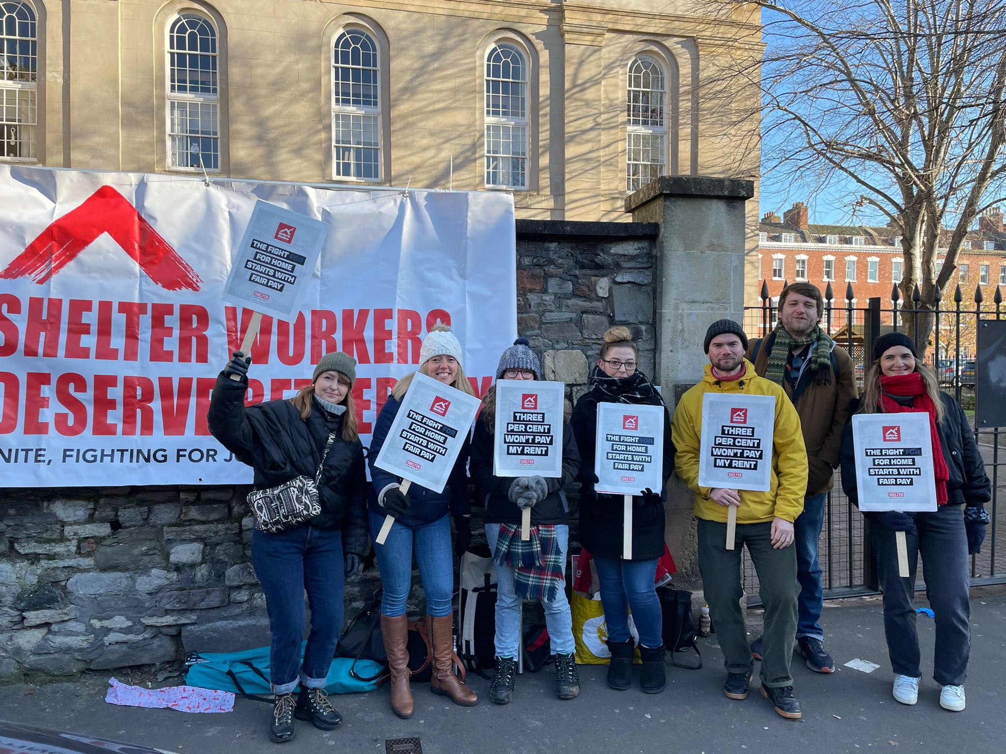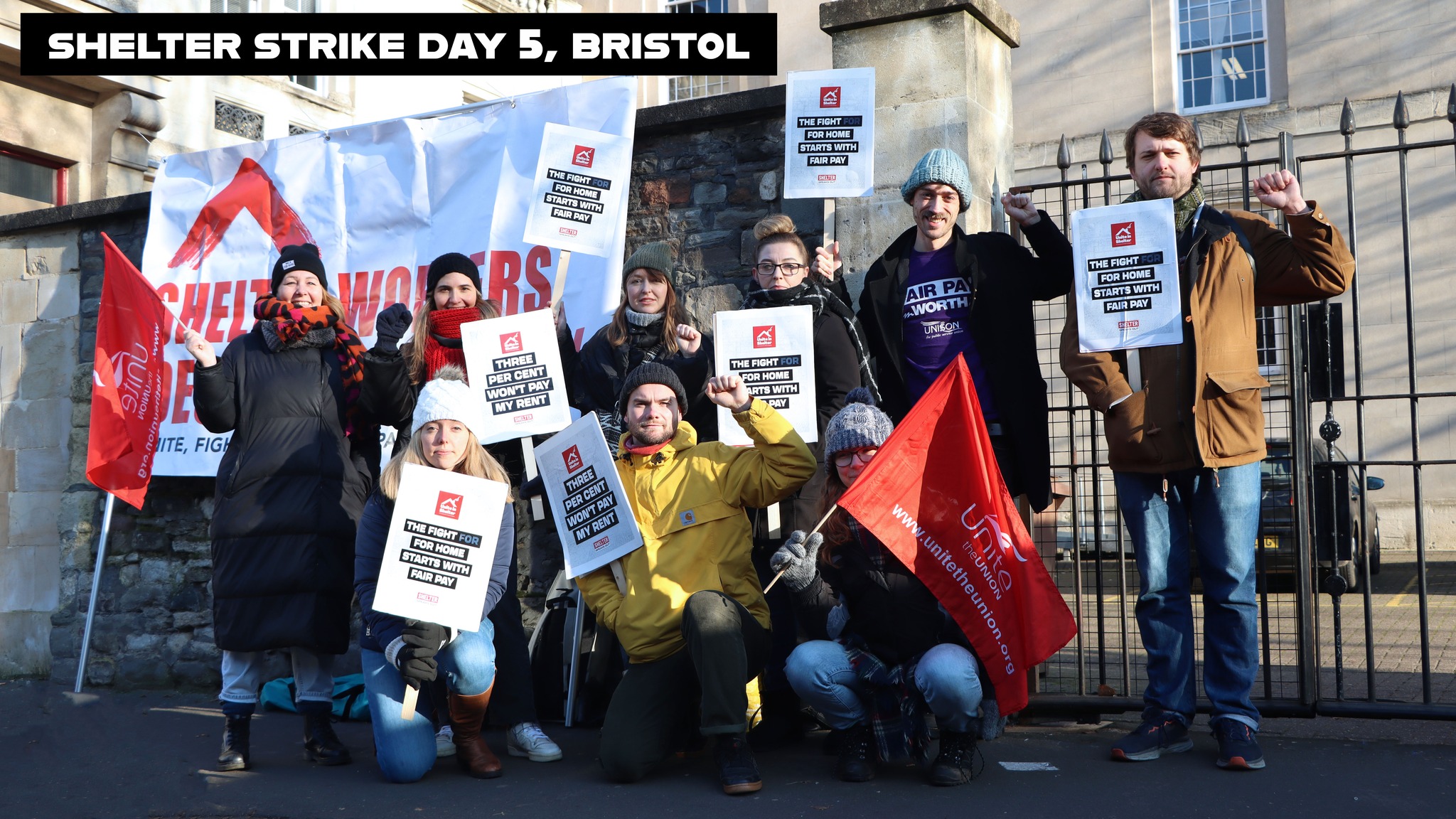 Shelter workers fight pay cut Posted byBristol TUCDecember 15, 2022April 19, 2025Posted indisputesTags:featured Unite members working for Shelter have started two weeks of strike action after management imposed a 3% pay rise, even though Unite estimates that the reserves are £14.5 million and inflation is surging over 14%! Share this: Click to share on X (Opens in new window) X Click to share on Facebook (Opens in new window) Facebook Like Loading...