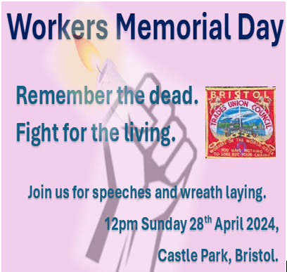 Join us at 12pm, Sunday 28th April 2024 to lay wreaths and share speeches from union activists to mourn workers killed and to continue to struggle our hardest to fight for safe workplaces of the future.