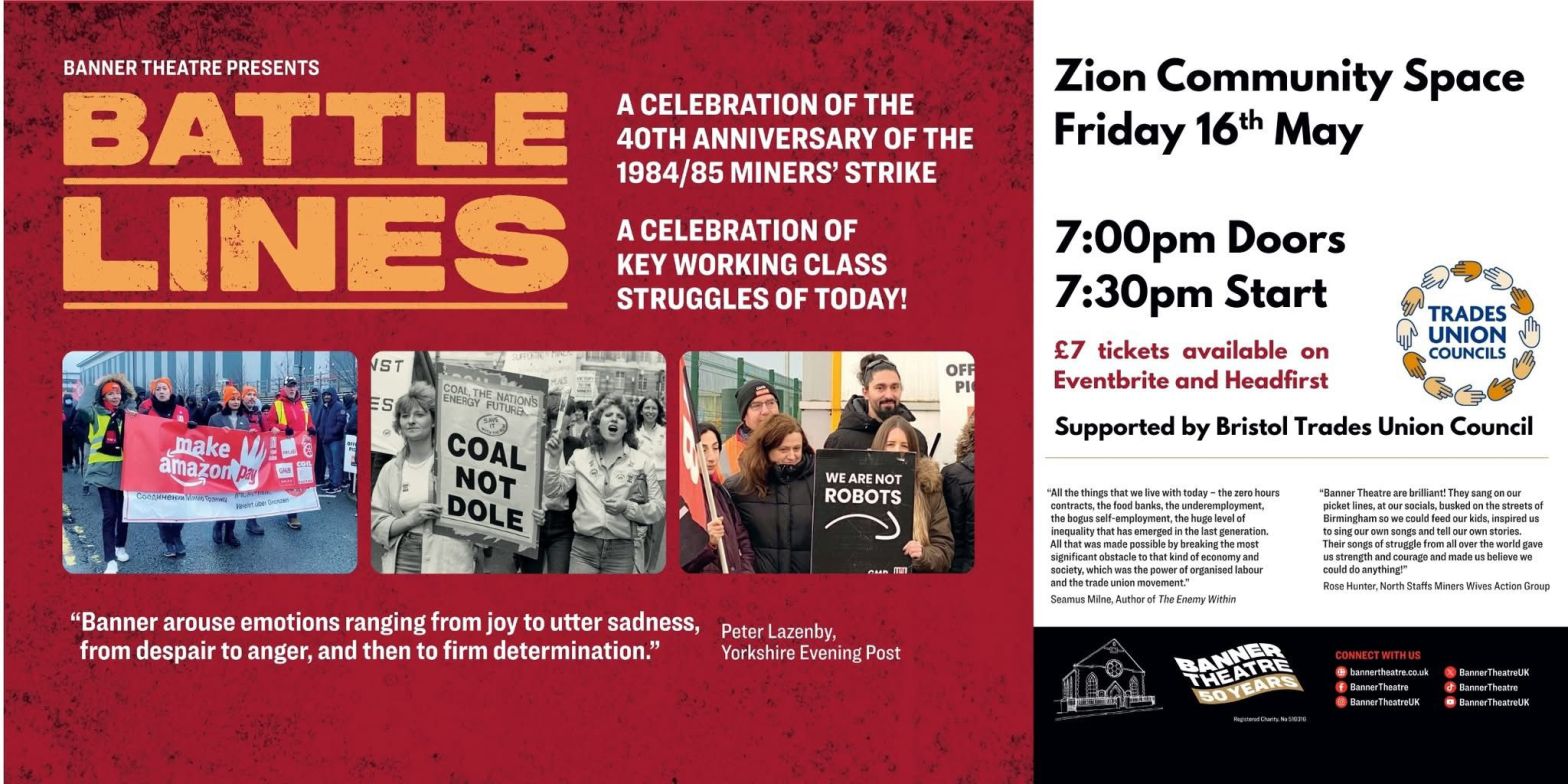 Join us at the Zion theatre in Bedminster Down for a powerful night of live performance, music, and storytelling as Banner Theatre commemorates the 40th anniversary of the 1984–85 miners’ strike — a pivotal chapter in working-class history.