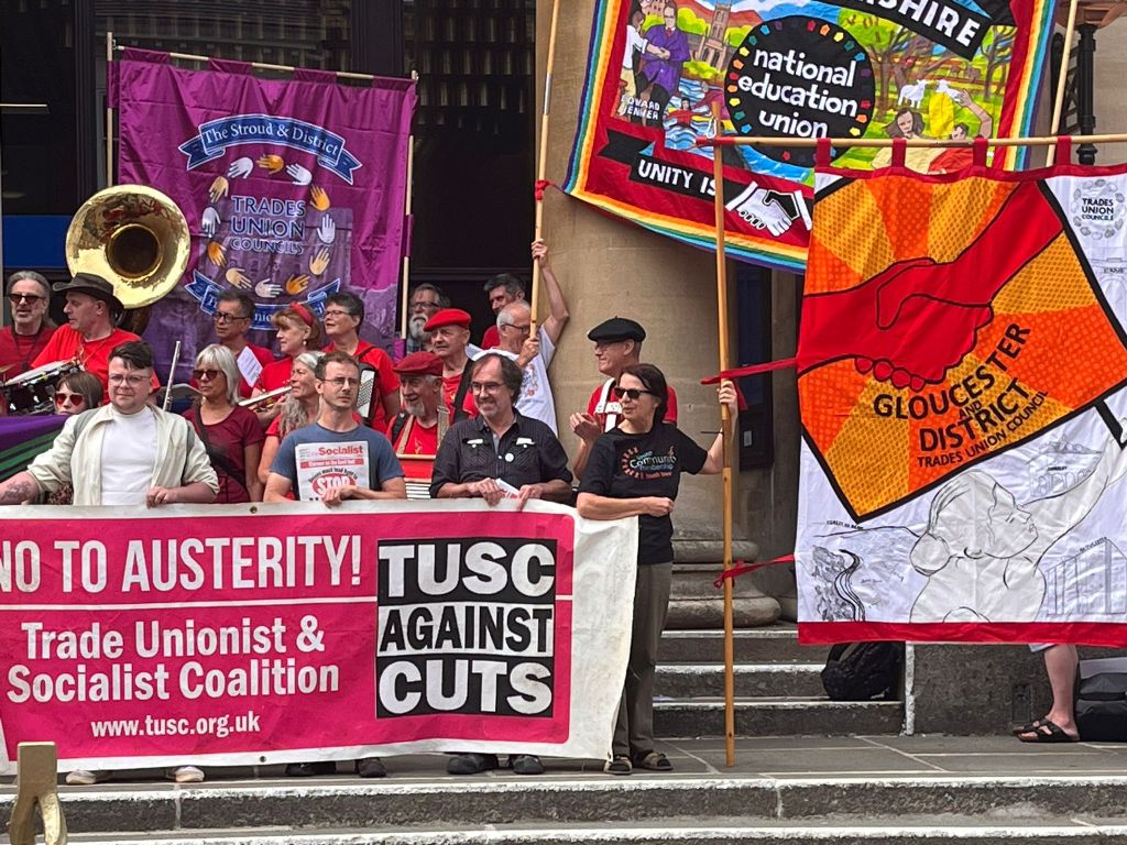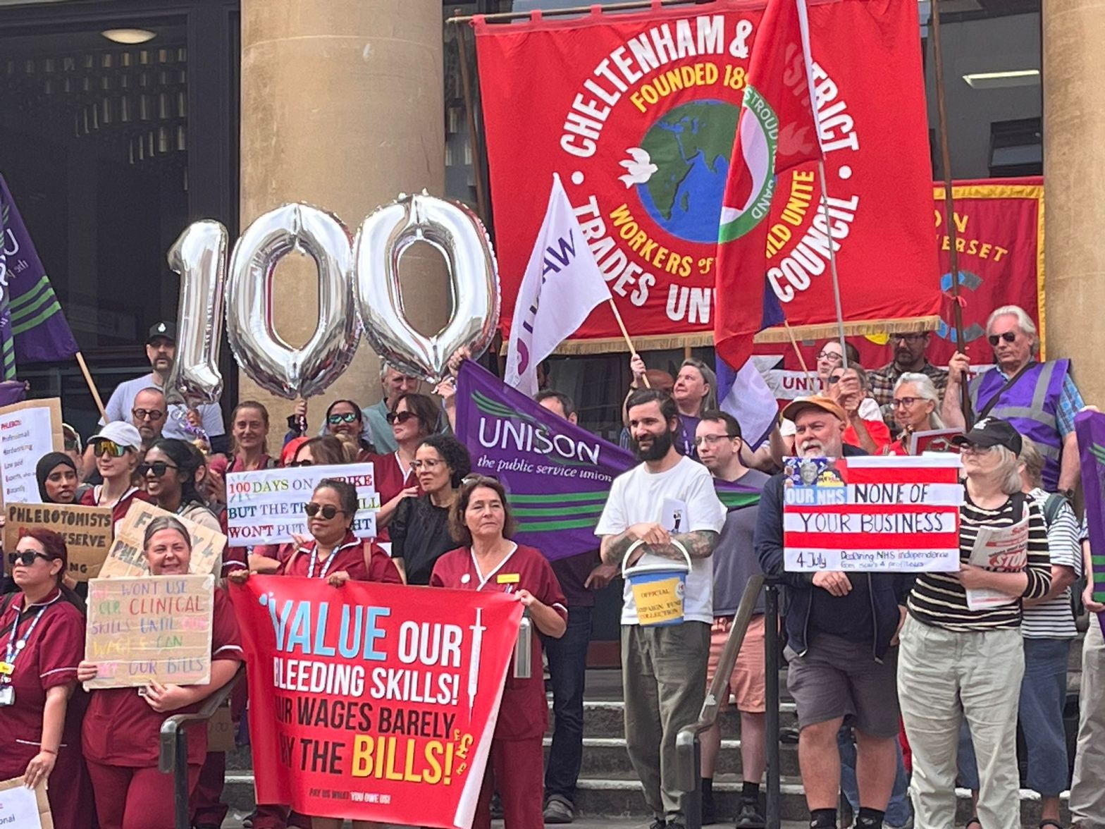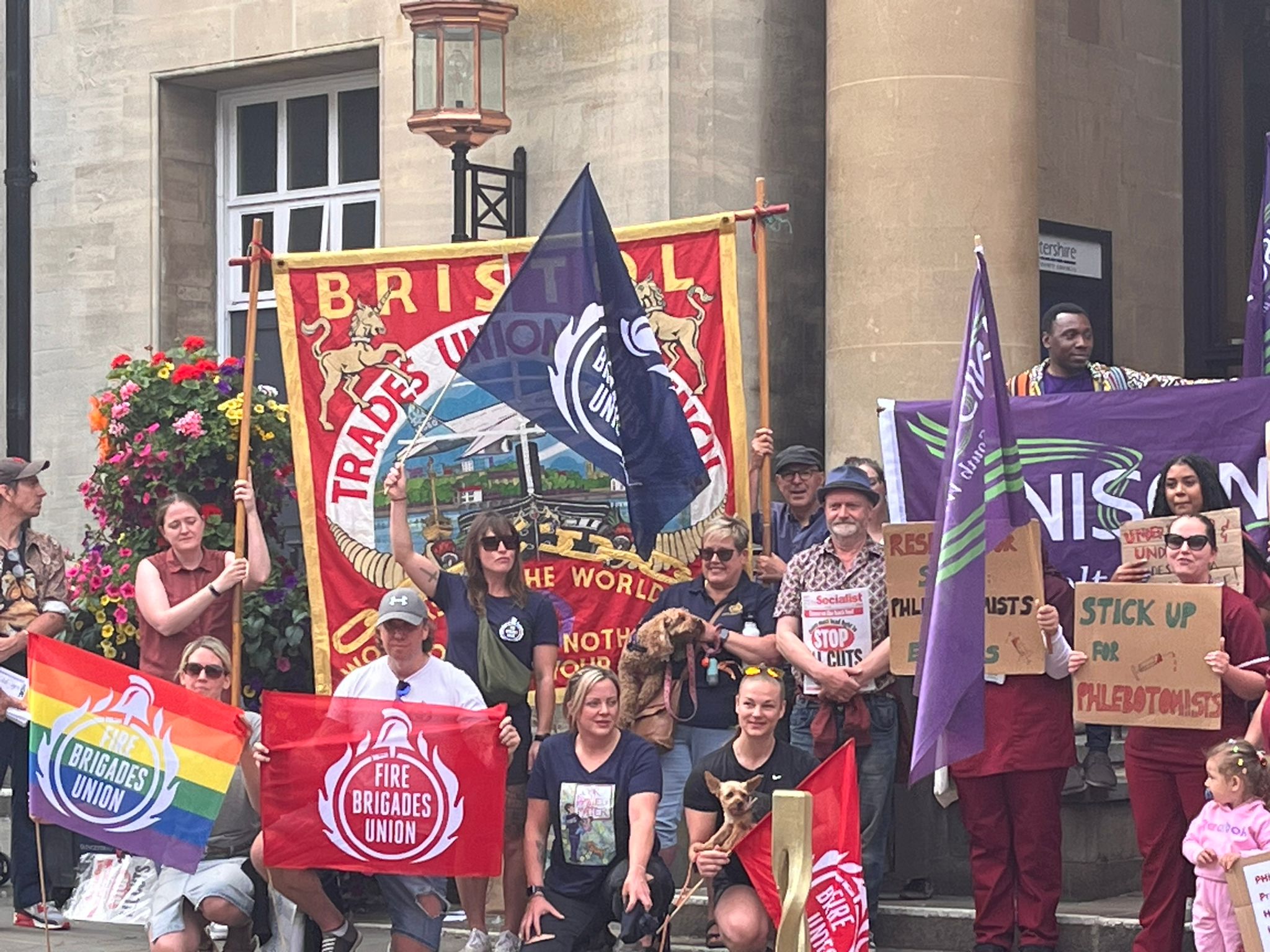 The Bristol Trades Council joined Unison’s “Magnificent 37” phlebotomists at Gloucester Shire Hall on Friday. Along with delegations from Gloucestershire FBU, Gloucestershire NEU, USDAW A069, South West TUC, the Trade Union and Socialist Coalition (TUSC) and other trades councils, we stood in solidarity against low pay.