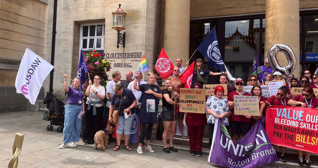 On strike since 17 March, phlebotomists at Gloucestershire Hospitals are fighting for fair pay after years of doing Band 3 work for Band 2 wages.